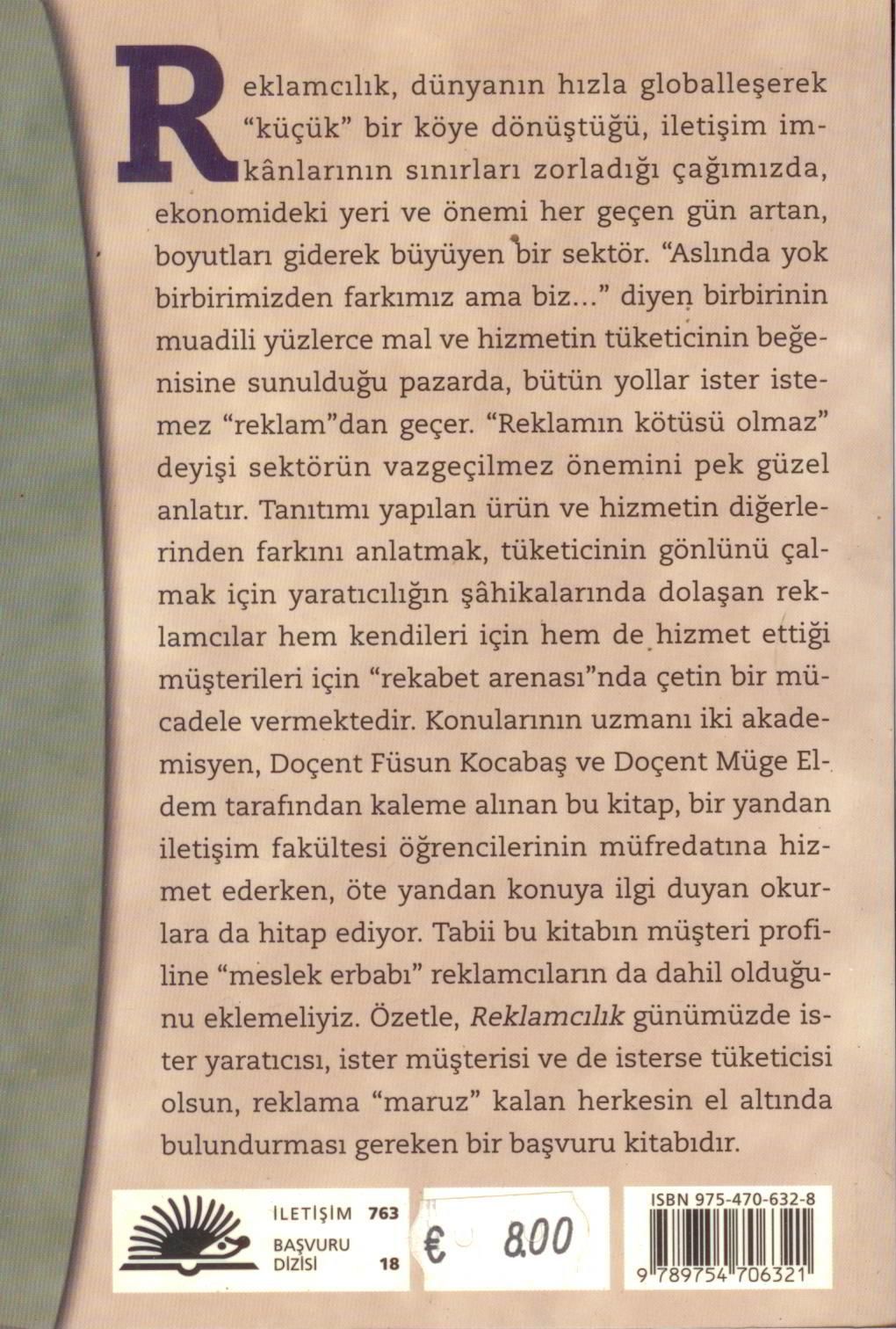 Reklamcılık, dünyanın hızla globalleşerek küçük bir köye dönüştüğü, iletişim imkânlarının sınırları zorladığı çağımızda, ekonomideki yeri ve önemi her geçen gün artan, boyutları giderek büyüyen bir sektör. Aslında yok birbirimizden farkımız ama biz diyen birbirinin muadili yüzlerce mal ve hizmetin tüketicinin beğenisine sunulduğu pazarda, bütün yollar ister istemez reklamdan geçer. Reklamın kötüsü olmaz deyişi sektörün vazgeçilmez önemini pek güzel anlatır. Tanıtımı yapılan ürün ve hizmetin diğerlerinden farkını anlatmak, tüketicinin gönlünü çalmak için yaratıcılığın şâhikalarında dolaşan reklamcılar hem kendileri için hem de hizmet ettiği müşterileri için rekabet arenasında çetin bir mücadele vermektedir. Konularının uzmanı iki akademisyen, Doçent Füsun Kocabaş ve Doçent Müge Eldem tarafından kaleme alınan bu kitap, bir yandan iletişim fakültesi öğrencilerinin müfredatına hizmet ederken, öte yandan konuya ilgi duyan okurlara da hitap ediyor. Tabii bu kitabın müşteri profiline meslek erbabı reklamcıların da dahil olduğunu eklemeliyiz. Özetle, Reklamcılık günümüzde ister yaratıcısı, ister müşterisi ve de isterse tüketicisi olsun, reklama maruz kalan herkesin el altında bulundurması gereken bir başvuru kitabıdır.
