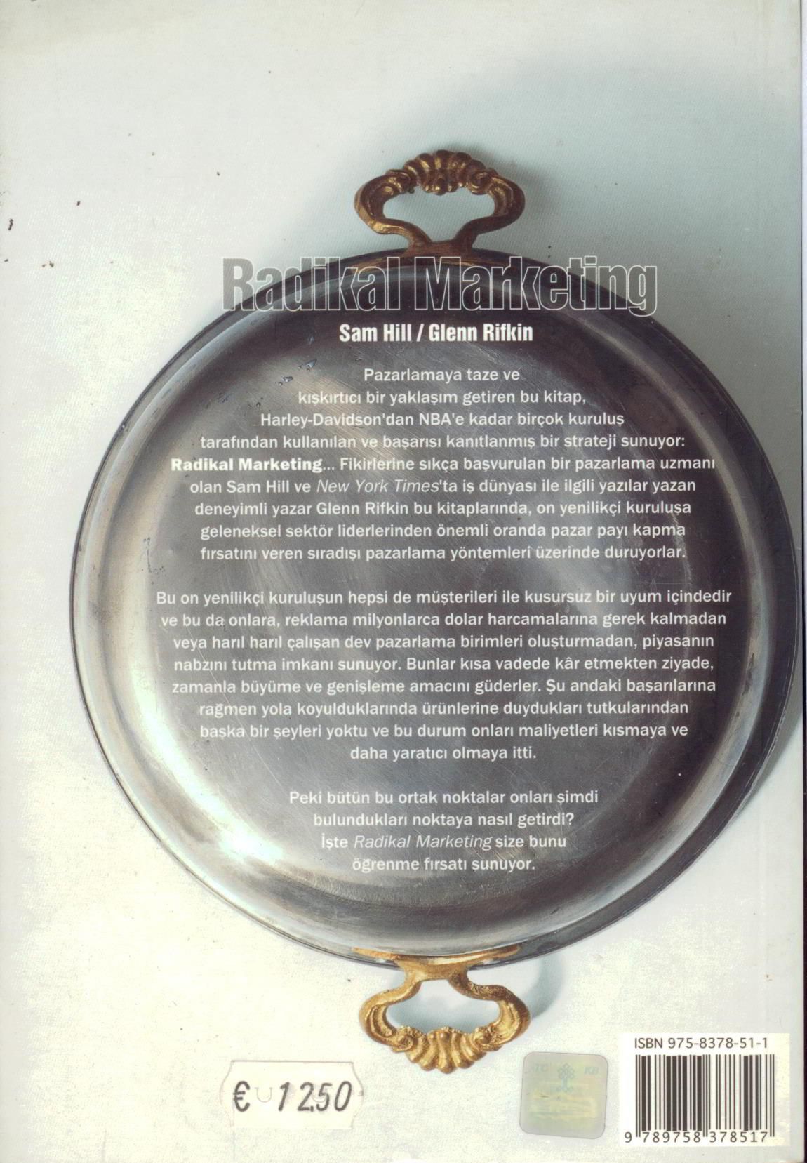 Harley-Davidson`dan NBA`e kadar birçok kuruluş tarfından kullanılan ve başarısı kanıtlanmış bir strateji sunuyor: Radikal Marketing... Fikirlerine sıkça başvurulan bir pazarlama uzmanı olan Sam Hill ve New York Times`ta iş dünyası ile ilgili yazılar yazan deneyimli yazar Glenn Rifkin bu kitaplarında. on yenilikçi kuruluşa geleneksek sektör liderlerinden önemli oranda pazar payı kapma fırsatını veren sıradışı pazarlama yöntemleri üzerinde duruyorlar.