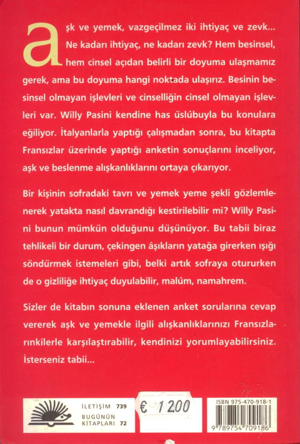 Aşk ve yemek, vazgeçilmez iki ihtiyaç ve zevk... Ne kadarı ihtiyaç, ne kadarı zevk? Hem besinsel, hem cinsel açıdan belirli bir doyuma ulaşmamız gerek, ama bu doyuma hangi noktada ulaşırız. Besinin besinsel olmayan işlevleri ve cinselliğin cinsel olmayan işlevleri var. Willy Pasini kendine has üslubuyla bu konulara eğiliyor. İtalyanlarla yaptığı çalışmadan sonra, bu kitapta Fransızlar üzerinde yaptığı anketin sonuçlarını inceliyor, aşk ve beslenme alışkanlııklarını ortaya çıkarıyor.