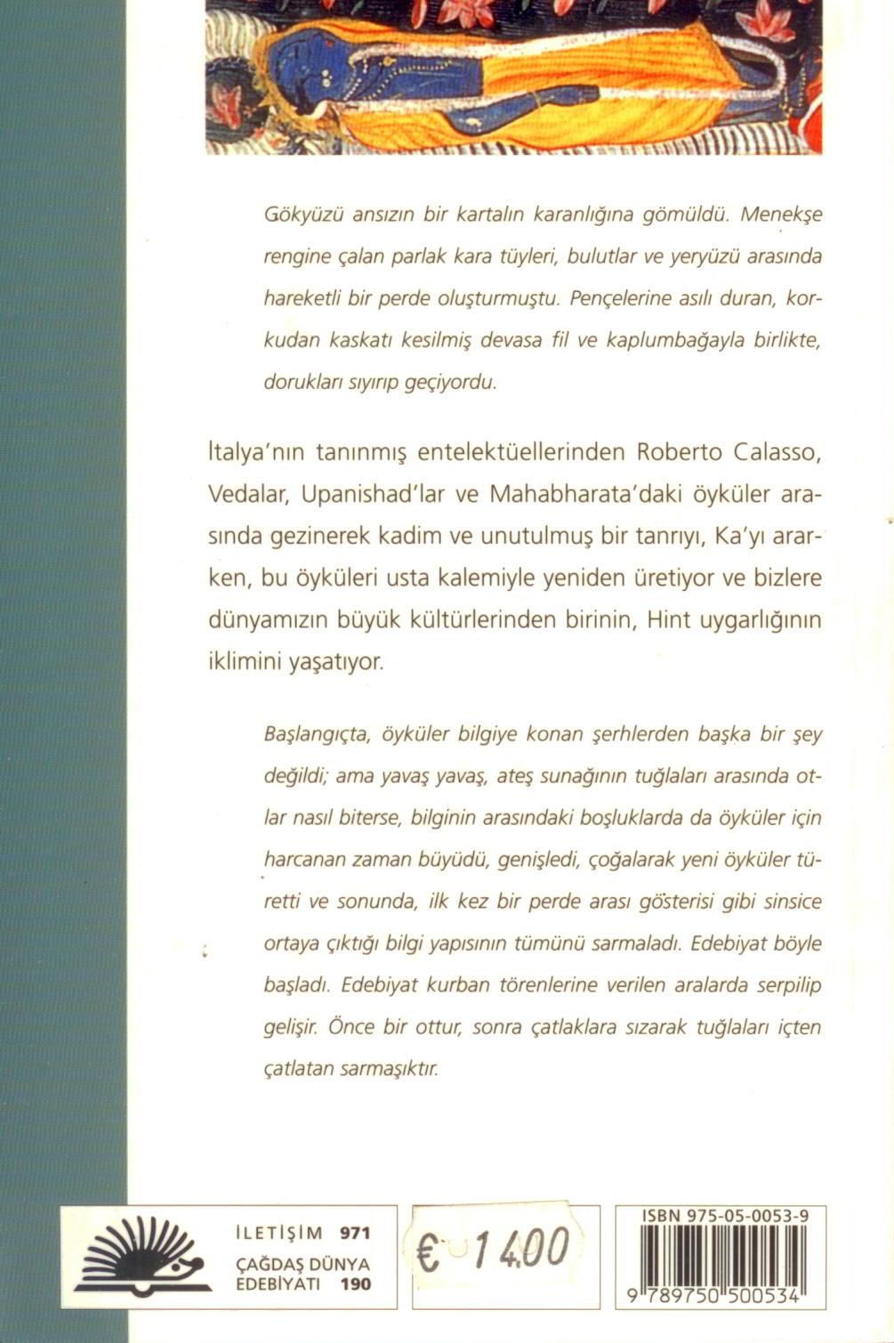 İtalya'nın tanınmış entelektüellerinden Roberto Calasso, Vedalar, Upanishad'lar ve Mahabharata'daki öyküler arasında gezinerek kadim ve unutuluş bir tanrıyı, Ka'yı ararken, bu öyküleri usta kalemiyle yeniden üretiyor ve bizlere dünyamızın büyük kültürlerinden birinin, Hint uygarlığını iklimini yaşatıyor.