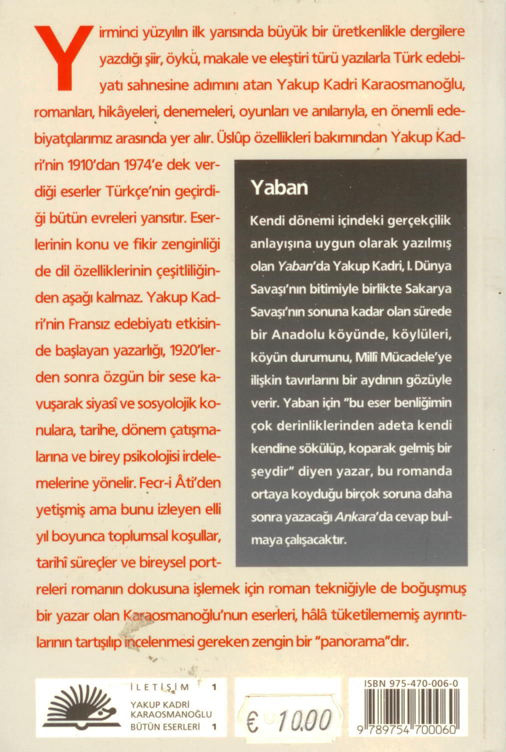 Yirminci yüzyılın ilk yarısında büyük bir üretkenlikle dergilere yazdığı şiir, öykü, makale ve eleştri türü yazılarla Türk edebiyatı sahnesine adımını atan Yakup KAdri Karaosmanoğlu, romanları, hikayeleri, denemeler, oyunları ve anılarıyla, en önemli edebiyatçılarımız arasında yer alır. Üslup özellikleri bakımından Yakup Kadri`nin 1910`dan 1974`e dek verdiği eserler Türkçe`nin geçirdiği bütün evreleri yansıtır. Eserlerinin konu ve fikir zenginliği de dil özelliklerinin çeşitliliğinden aşağı kalmaz. Yakup Kadri`nin Fransız edebiyatı etkisinde başlayan yazarlığı, 1920`lerden sonra özgün bir sese kavuşarak siyasş ve sosyolojik konulara, tarihe, dönem çatışmalarına ve birey psikolojisi irdelemelerine yönelir. Fecr-i Ati`den yetişmiş ama bunu izleyen elli yıl boyunca toplumsal koşullar, tarihi süreçler ve bireysel portreleri romanın dokusuna işlemek için roman tekniğiyle de boğuşmuş bir yazar olan Karaosmanoğlu`nun eserleri, hala tüketilmemiş ayrıntılarının tartışılıp incelenmesi gereken zengin bir "panorama"dır.