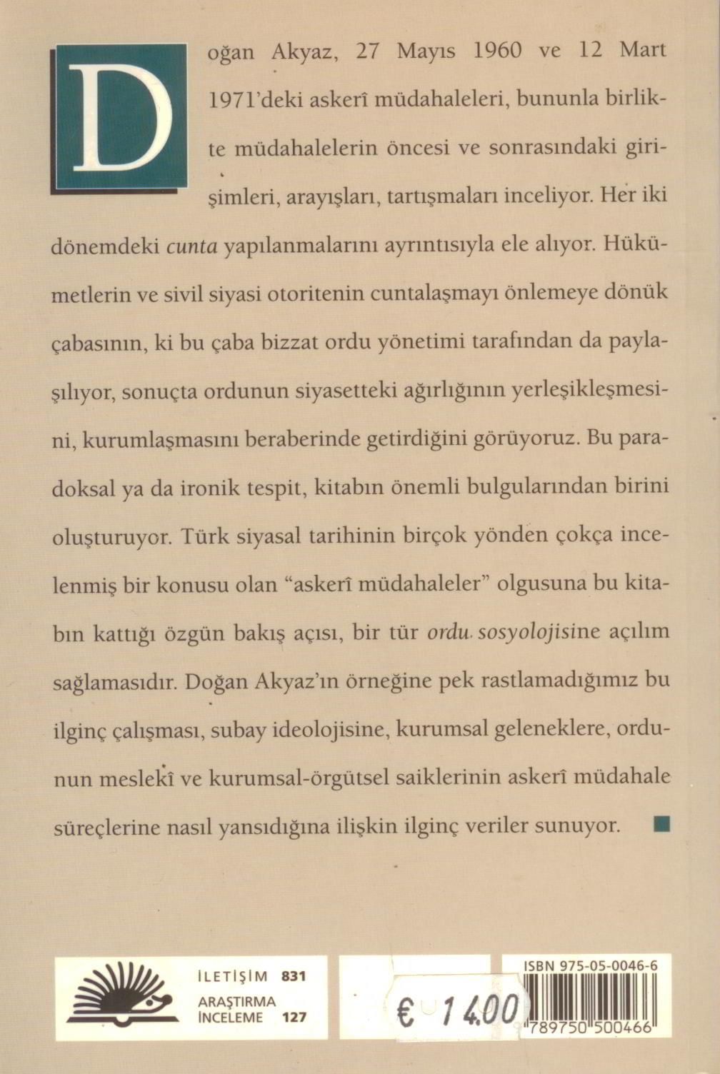 Doğan Akyaz, 27 Mayıs 1960 ve 12 Mart 1971`deki askeri müdahaleleri, bununla birlikte müdahalelerin öncesi ve sonrasındaki girişimleri, arayışları, tartışmaları inceliyor. Her iki dönemdeki cunta yapılanmalarını ayrıntısıyla ele alıyor. Hükümetlerin ve sivil siyasi otoritenin cuntalaşmayı önlemeye dönük çabasının, ki bu çaba bizzat ordu yönetimi tarafından da paylaşılıyor, sonuçta ordunun siyasetteki ağırlığının yerleşikleşmesini, kurumlaşmasını beraberinde getirdiğini görüyoruz. Bu paradoksal ya da ironik tespit, kitabın önemli bulgularından birini oluşturuyor. Türk siyasal tarihin birçok yönden çokça incelenmiş bir konusu olan askeri mühadaleler" olgusuna bu kitabın kattığı özgün bakış açısı, bir tür ordu sosyolojisine açılım sağlamasıdır.
