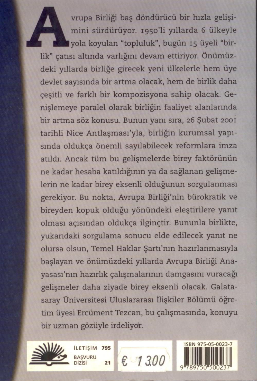 Avrupa Birliği baş döndürücü bir hızla gelişimini sürdürüyor. 1950`li yıllarda 6 ülkeyle yola koyulan "topluluk" bugün 15 üyeli "birlik" çatısı altında varlığını devam ettiriyor. Önümüzdeki yıllarda birliğe girecek yeni ülkelerle hem üye devlet sayısında bir artma olacak, hem de birlik daha çeşitli ve farklı bir kompozisyona sahip olacak. Genişlemeye paralel olarak birliğin faaliyet alanlarında bir artma söz konusu. Bunun yanı sıra, 26 Şubat 2001 tarihli Nice Antlaşması`yla, birliğin kurumsal yapısında oldukça önemli sayılabilecek reformlara imza atıldı. Ancak tüm bu gelişmelerde birey faktörünün ne kadar hesaba katıldığının ya da sağlanan gelişmelerin ne kadar birey faktörünün ne kadar hesaba katıldığının ya da sağlanan gelişmelrin ne kadar birey eksenli olduğunun sorgulanması gerekiyor.