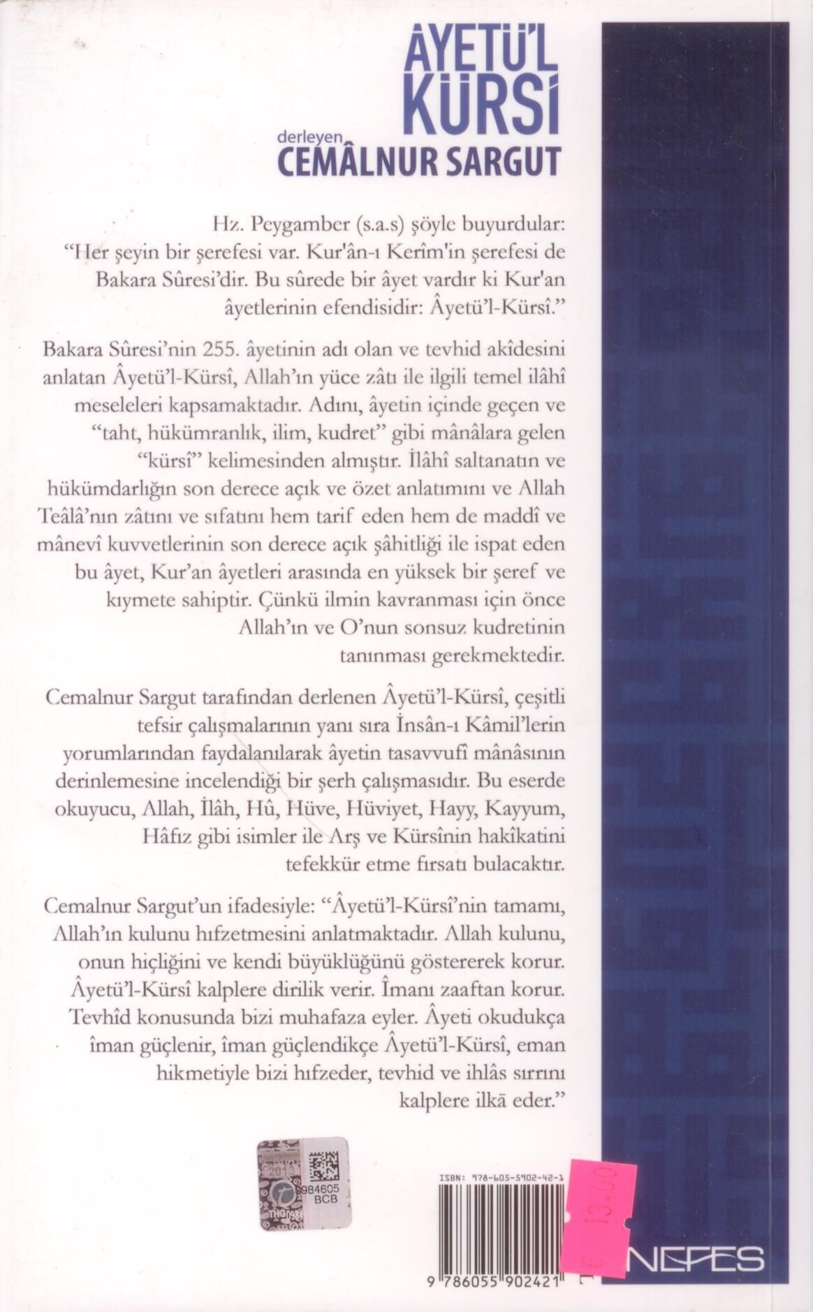 Cemalnur Sargut tarafından derlenen Âyetü'l-Kürsî, çeşitli tefsir çalışmalarının yanı sıra İnsân-ı Kâmil'lerin yorumlarından faydalanılarak âyetin tasavvufî mânâsının derinlemesine incelendiği bir şerh çalışmasıdır. Bu eserde okuyucu, Allah, İlâh, Hu, Hüve, Hüviyet, Hayy, Kayyum, Hâfız gibi isimler ile Arş ve Kürsî'nin hakîkatini tefekkür etme fırsatı bulacaktır.
