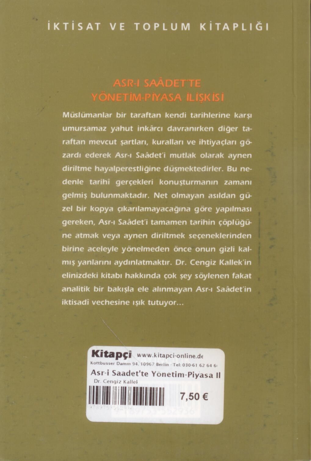Müslümanlar bir taraftan kendi tarihlerine karşı umursamaz yahut inkarcı davranırken diğer taraftan mevcut şartları, kuralları ve ihtiyaçları gözardı ederek Asr-ı Saadet-i mutlak olarak aynen diriltme hayalperestliğine düşmektedirler. Bu nedenle tarihi gerçekleri konuşturmanın zamanı gelmiş bulunmaktadır. Net olmayan asıldan güzel bir kopya çıkarılamayacağına göre yapılması gereken, Asr-ı Saadet'i tamamen tarihin çöplüğüne atmak veya aynen diriltmek seçeneklerinden birine aceleyle yönelmeden önce onun gizli kalmış yanlarını aydınlatmaktır. Dr. Cengiz Kallek'in elinizdeki kitabı hakkında çok şey söylenen fakat analitik bir bakışla ele alınmayan Asr-ı Saadet'in iktisadi vechesine ışık tutuyor...