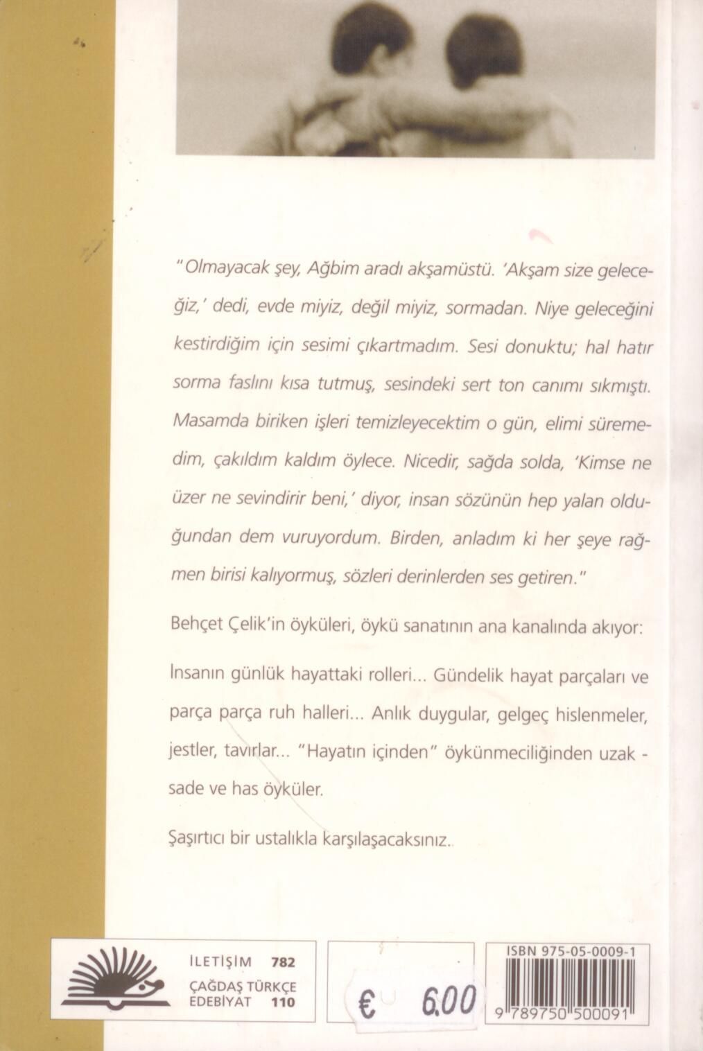 "Olmayacak şey, Ağbum aradı akşamüstü. 'Akşam size geleceğiz' dedi, evde miyiz, değil miyiz, sormadan. Niye geleceğini kestirdiğim için sesimi çıkartmadım. Sesi donuktu; hal hatır sorma faslını kısa tutmuş, sesindeki sert ton canımı sıkmıştı. Masamda biriken işleri temizleyecektim o gün, elimi süremedim, çakıldım kaldım öylece. Nicedir, sağda solda, 'Kimse ne üzer ne sevindirir beni,' diyor, insan sözünün hep yalan olduğundan dem vuruyordum. Birden, anladım ki her şeye rağmen birisi kalıyormuş, sözleri derinlerden ses getiren."Behçet Çelik'in öyküleri, öykü sanatının ana kanalında akıyor: İnsanın günlük hayattaki rolleri.. Gündelik hayat parçaları ve parça parça ruh halleri.. Anlık duygular, gelgeç hislenmeler, jestler, tavırlar... "Hayatın içinden" öykünmeciliğinden uzak sade ve has öyküler. Şaşırtıcı bir ustalıkla karşılaşacaksınız.