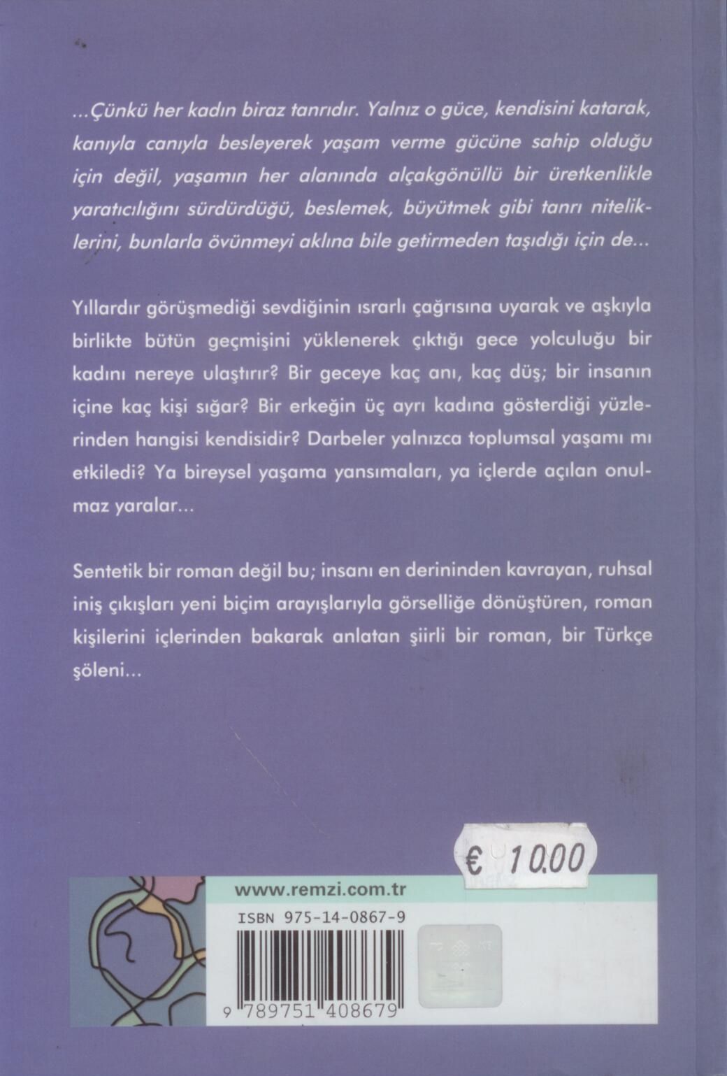 Yıllardır görüşmediği sevdiğinin ısrarlı çağrısına uyarak ve aşkıyla birlikte bütün geçmişini yüklenerek çıktığı gece yolculuğu bir kadını nereye ulaştırır? Bir geceye kaç anı, kaç düş; bir insanın içine kaç kişi sığar? Bir erkeğin üç ayrı kadına gösterdiği yüzlerinden hangisi kendisidir? Darbeler yalnızca toplumsal yaşamı mı etkiledi? Ya bireysel yaşama yansımaları, ya içlerde açılan onulmaz yaralar...