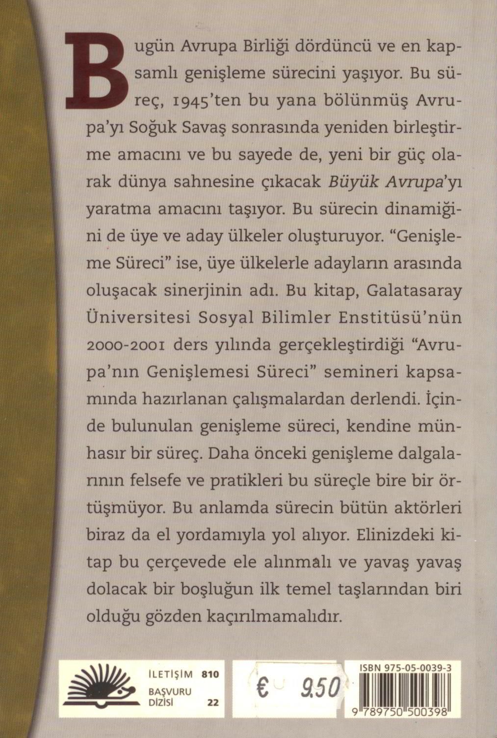 Bugün Avrupa Birliği dördüncü ve en kapsamlı genişleme sürecini yaşıyor. Bu süreç, 1945`ten bu yana bölünmüş Avrupa`yı Soğuk Savaş sonrasında yeniden birleştirme amacını ve bu sayede de, yeni bir güç olarak dünya sahnesine çıkacak Büyük Avrupa`yı yaratma amacını taşıyor. Bu sürecin dinamiğini de üye ve aday ülkeler oluşturuyor. "Genişleme Süreci" ise, üye ülkelerle adayların arasında oluşacak sinerjinin adı. Bu kitap, Galatasaray Üniversitesi Sosyal Bilimler Enstitüsü`nün 2000-2001 ders yılında gerçekleştirdiği "Avrupa`nın Genişlemesi Süreci" semineri kapsamında hazırlanan çalışmalardan derlendi. İçinde bulunulan genişleme süreci, kendine münhasır bir süreç. Daha önceki genişleme dalgalarının felsefe ve pratikleri bu süreçle bire bir örtüşmüyor. Bu anlamda sürecin bütün aktörleri biraz da el yordamıyla yol alıyor. Bu kitap bu çerçevede ele alınmalı ve yavaş yavaş dolacak bir boşluğun ilk temel taşlarından biri olduğu gözden kaçırılmamalıdır.