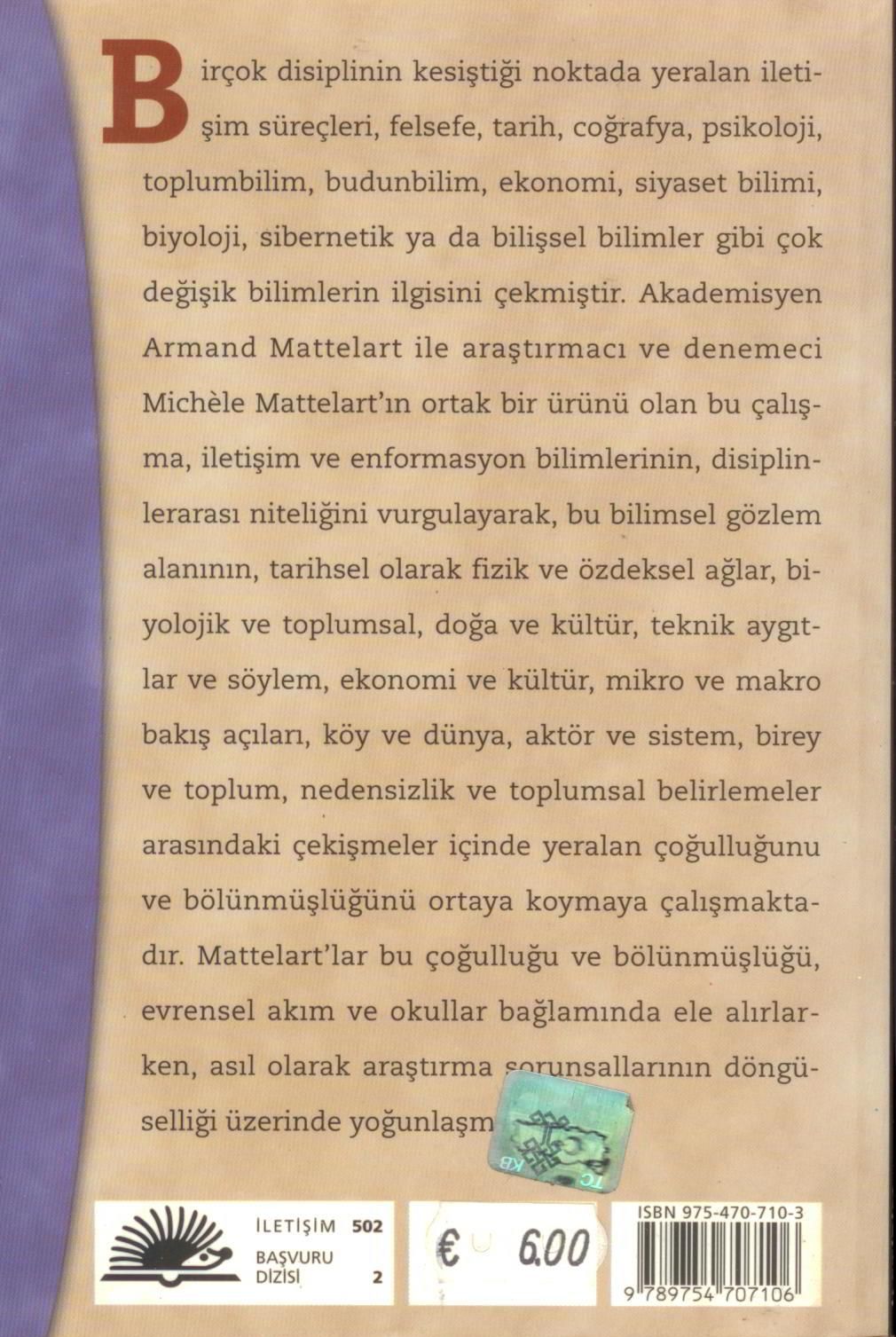 Birçok disiplinin kesiştiği noktada yeralan iletişim süreçleri, felsefe, tarih, coğrafya, psikoloji, toplumbilim, budunbilim, ekonomi, siyaset bilimi, biyoloji, sibernetik ya da bilişsel bilimler gibi çok değişik bilimlerin ilgisini çekmiştir. Akademisyen Armand Mattelart ile araştırmacı ve denemeci Michele Mattelartın ortak bir ürünü olan bu çalışma, iletişim ve enformasyon bilimlerinin, disiplinlerarası niteliğini vurgulayarak, bu bilimsel gözlem alanının, tarihsel olarak fizik ve özdeksel ağlar, biyolojik ve toplumsal, doğa ve kültür, teknik aygıtlar ve söylem, ekonomi ve kültür, mikro ve makro bakış açıları, köy ve dünya, aktör ve sistem, birey ve toplum, nedensizlik ve toplumsal belirlemeler arasındaki çekişmeler içinde yeralan çoğulluğunu ve bölünmüşlüğünü ortaya koymaya çalışmaktadır. Mattelartlar bu çoğulluğu ve bölünmüşlüğü, evrensel akım ve okullar bağlamında ele alırlarken, asıl olarak araştırma sorunsallarının döngüselliği üzerinde yoğunlaşmaktadırlar.