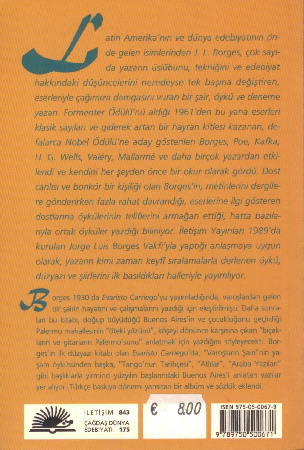 Latin Amerika`nın ve dünya edebiyatının önde gelen isimlerinden J.L. Borges, çok sayıda yazarın üslubunu, tekniğini ve edebiyat hakkındaki düşüncelerini neredeyse tek başına değiştiren, eserleriyle çağımıza damgasını vuran bir şair, öykü ve deneme yazarı. Formenter Ödülü`nü aldığı 1961`den bu yana eserleri klasik sayılan ve giderek artan bir hayran kitlesi kazanan, defalarca Nobel Ödülü`ne aday gösterilen Borges, Poe, Kafka, H.G. Wells, Valery, Mallarme ve daha birçok yazardan etkilendi ve kendini her şeyden önce bir okur olarak gördü. Dost canlısı ve bonkör bir kişiliği olan Borges`in, metinlerini dergilere gönderirken fazla rahat davrandığı, eserlerine ilgi gösteren dostlarına öykülerinin teliflerini armağan ettiği, hatta bazılarıyla ortak öyküler yazdığı biliniyor. İletişim Yayınları 1989`da kurulan Borges Vakfı`yla yaptığı anlaşmaya uygun olarak, yazarın kimi zaman keyfi sıralamalarla derlenen öykü, düzyazı ve şiirlerini ilk basıldıkları halleriyle yayımlıyor.