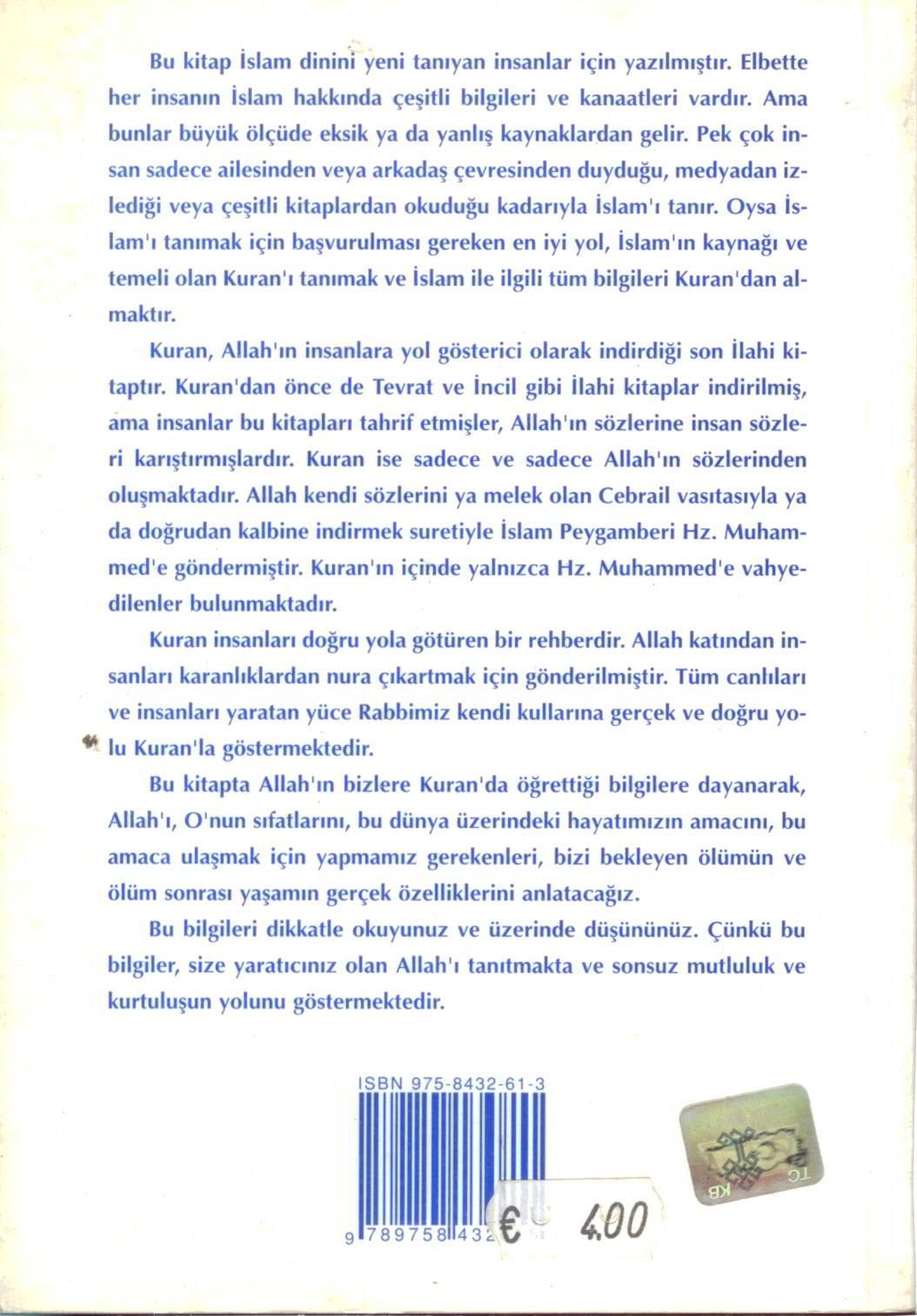 Bu kitapta, Yüce Allah'ın bizlere Kuran'da öğrettiği bilgilere dayanarak, Allah'ı, O'nun sıfatlarını, bu dünya üzerindeki hayatımızın amacını, bu amaca ulaşmak için yapmamız gerekenleri, bizi bekleyen ölümün ve ölüm sonrası yaşamın gerçek özelliklerini anlatacağız.