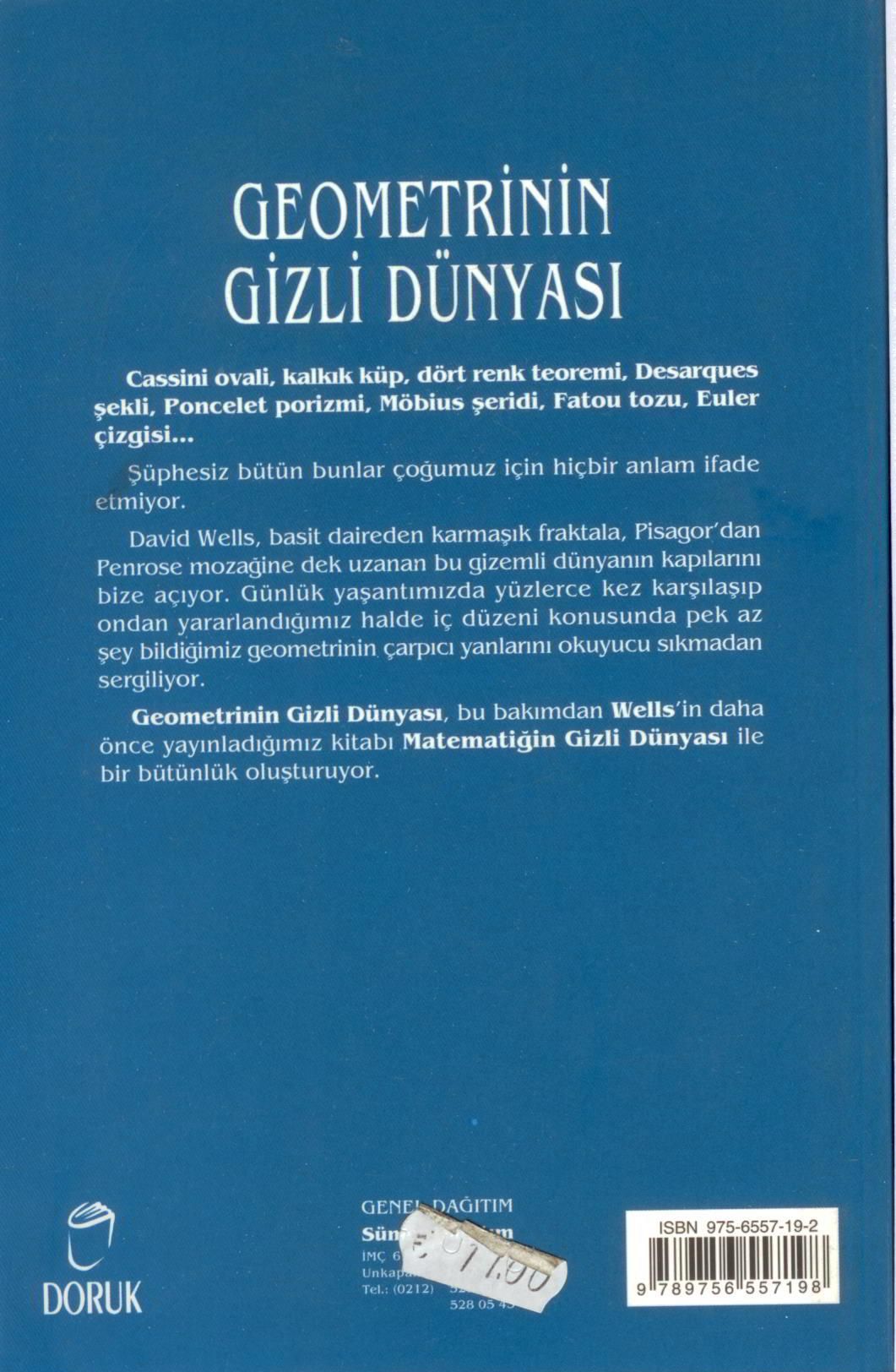 Şüphesiz bütün bunlar çoğumuz için hiçbir anlam ifade etmiyor. David Wells, basit daireden karmaşık fraktale, Pisagordan Penrose mozağine uzanan bu gizemli dünyanın kapılarını bize açıyor. Günlük yaşantımızda yüzlerce kez karşılaşıp ondan yararlandığımız halde iç düzeni konusunda pek az şey bildiğimiz geometrinin çarpıcı yanlarını okuyucuyu sıkmadan sergiliyor.