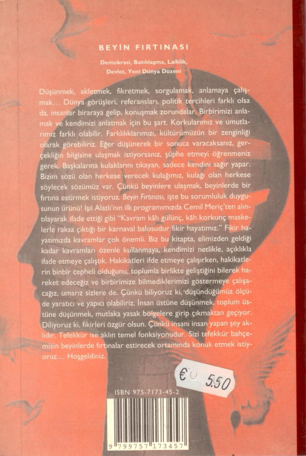 Düşünmek, akletmek, fikretmek, sorgulamak, anlamaya çalışmak... Dünya görüşleri, referansları, politik tercihleri farklı olsa da, insanlar biraraya gelip, konuşmak zorundalar. Birbirimizi anlamak ve kendimizi anlatmak için bu şart. Korkularımız ve umutlarımız farklı olabilir. Farklılıklarımızı, kültürümüzün bir zenginliği olarak görebiliriz. Eğer düşünerek bir sonuca varacaksanız, gerçekliğin bilgisine ulaşmak istiyorsanız, şüphe etmeyi öğrenmeniz gerek. Başkalarına kulaklarını tıkayan, sadece kendini sağır yapar. Bizim sözü olan herkese verecek kulağımız, kulağı olan herkese söyleyecek sözümüz var. Çünkü beyinlere ulaşmak, beyinlerde bir fırtına estirmek istiyoruz. "Beyin Fırtınası", işte bu sorumluluk duygusunun ürünü! Işıl Alatlı'nın ilk programımızda Cemil Meriç'ten alıntılayarak ifade ettiği gibi "Kavram kah gülünç, kah korkunç maskelerle raksa çıktığı bir karnaval balosudur fikir hayatımız." Fikir hayatımızda kavramlar çok önemli. Biz bu kitapta, elimizden geldiği kadar kavramları özenle kullanmaya, kendimizi netlikle, açıklıkla ifade etmeye çalıştık. Hakikatleri ifade etmeye çalışırken, hakikatlerin binbir cepheli olduğunu, toplumla birlikte geliştiğini bilerek hareket edeceğiz ve birbirimize bilmediklerimizi göstermeye çalışacağız, umarız sizlere de. Çünkü biliyoruz ki, düşündüğümüz ölçüde yaratıcı ve yapıcı olabiliriz. İnsan üstüne düşünmek, toplum üstüne düşünmek, mutlaka yasak bölgelere girip çıkmaktan geçiyor. Diliyoruz ki, fikirleri özgür olsun. Çünkü insanı insan yapan şey aklıdır. Tefekkür ise aklın temel fonksiyonudur. Sizi tefekkür bahçemizin beyinlerde fırtınalar estirecek ortamında konuk etmek istiyoruz... Hoşgeldiniz...