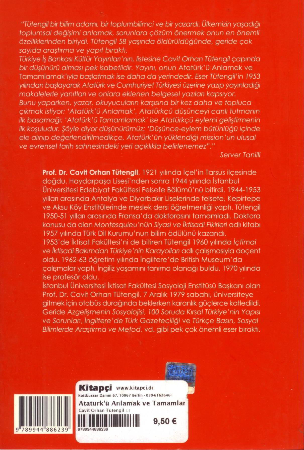 "Tütengil bir bilim adamı, bir toplumbilimci ve bir yazardı. Ülkemizin yaşadığı toplumsal değişimi anlamak, sorunlara çözüm önermek onun en önemli özelliklerinden biriydi. Tütengil 58 yaşında öldürüldüğünde, geride çok sayıda araştırma ve yapıt bıraktı.Türkiye iş Bankası Kültür Yayınları 'nın, listesine Cavit Orhan Tütengil çapında bir düşünürü alması pek isabetlidir. Yayını, onun Atatürk'ü Anlamak ve Tamamlamak'/y/a başlatmak ise daha da yerindedir. Eser Tütengil'in 1953 yılından başlayarak Atatürk ve Cumhuriyet Türkiyesi üzerine yazıp yayınladığı makalelerle yanıtları ve onlara eklenen belgesel yazıları kapsıyor. Bunu yaparken, yazar, okuyucuların karşısına bir kez daha ve topluca çıkmak istiyor: 'Atatürk'ü Anlamak', Atatürkçü düşünceyi canlı tutmanın ilk basamağı; 'Atatürk'ü Tamamlamak' ise Atatürkçü eylemi geliştirmenin ilk koşuludur. Şöyle diyor düşünürümüz: 'Düşünce-eylem bütünlüğü içinde ele alınıp değerlendirilmedikçe, Atatürk'ün yüklendiği mission'un ulusal ve evrensel tarih sahnesindeki yeri açıklıkla belirlenemez"."