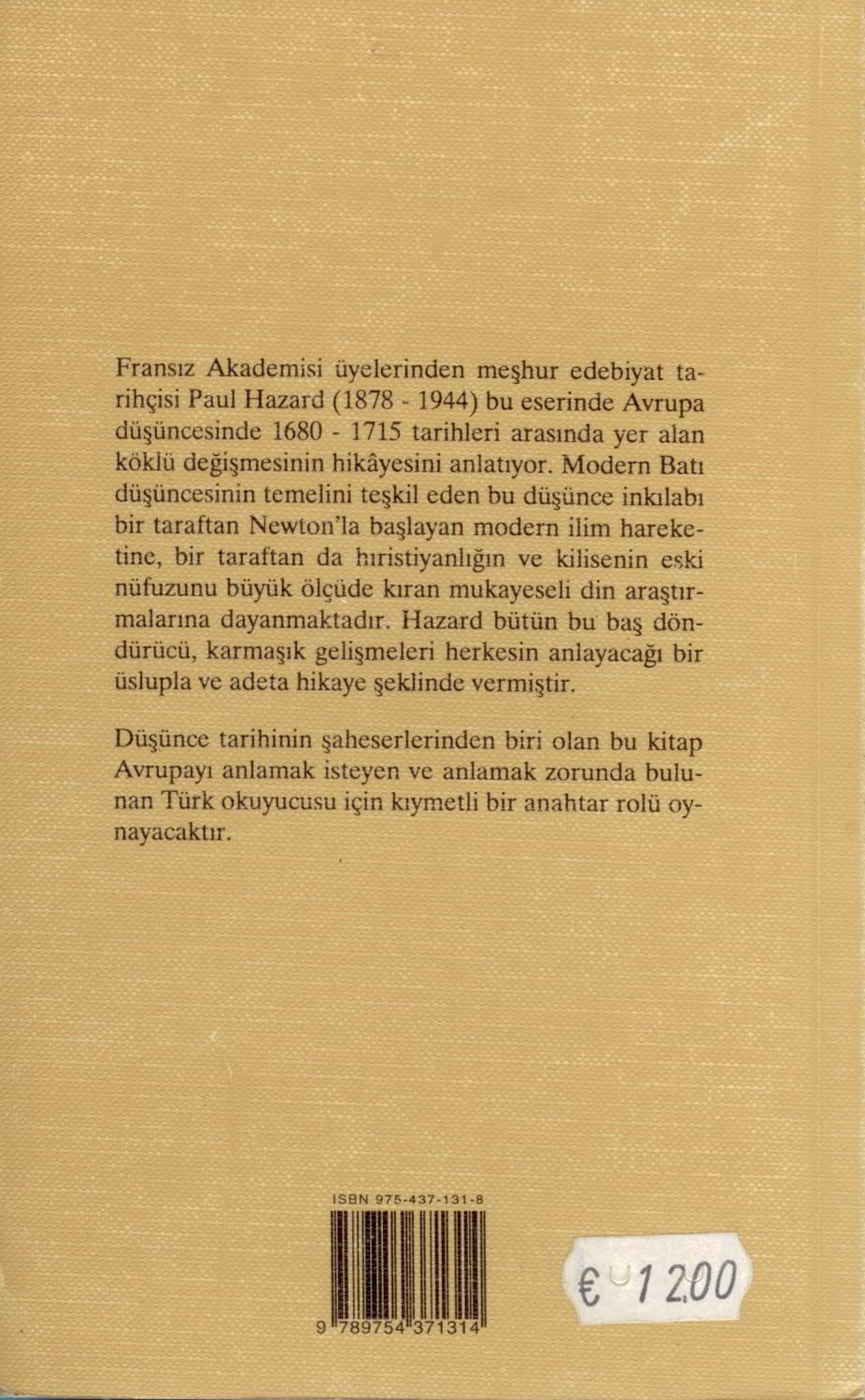 Fransız Akademisi üyelerinden meşhur edebiyat tarihçisi Paul Hazard bu eserinde Avrupa düşüncesinde 1680-1715 tarihleri arasında yer alan köklü değişmenin hikayesini anlatıyor. Modern Batı düşüncesinin temelini teşkil eden bu düşünce inkılabı bir taraftan Newton`la başlayan modern ilim hareketine, bir taraftan da hırıstiyanlığın ve kilisenin eski nüfuzunu büyük ölçüde kıran mukayeseli din araştırmalarına dayanmaktadır. Hazard bütün bu baş döndürücü, karmaşık gelişmeleri herkesin anlayacağı bir üslupla ve adeta hikâye şeklinde vermiştir.